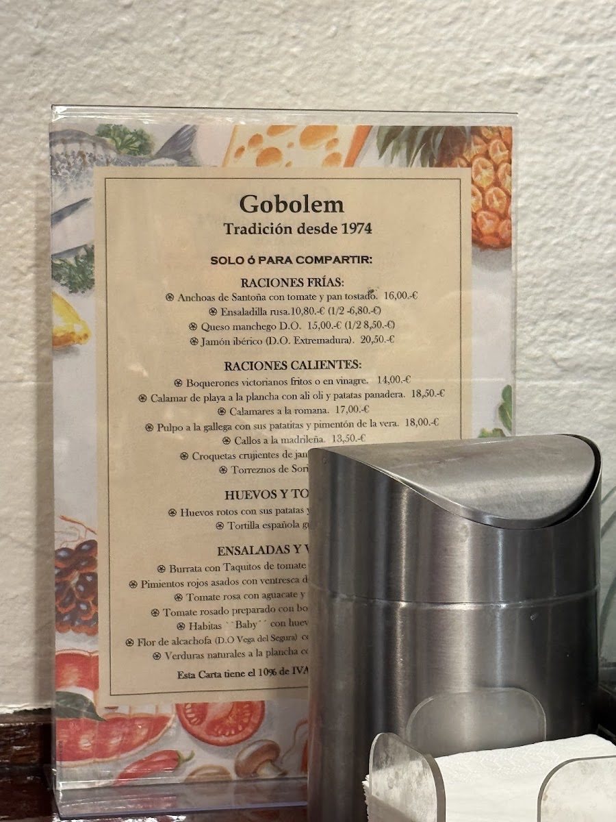 As you step inside, you're greeted by the warm decor and lively buzz of satisfied diners. The essence of a classic Spanish bar/restaurant is alive here; it's a place where the food speaks for itself. Restaurante Gobolem specializes in hearty dishes that showcase the best of Spanish cuisine, making it a must-visit for both locals and tourists alike.